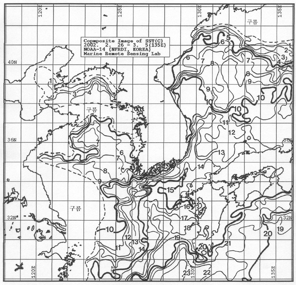 o 대화퇴 근해 3∼7도, 울릉도 근해 11∼12도, 대마도 근해 14∼15도, 제주도 근해 13∼15도, 이어도 근해 9∼10도, 일향초 근해 8∼10도, 어청도 근해 5∼6도 내외로 예상됩니다. o「평년에 비해」대화퇴 근해 0.5도 높게, 울릉도 근해 2도 높게, 대마도 근해 0.5도 높게, 제주도근해 비슷하게, 이어도 근해 0.5도 높게, 일향초 근해 1도 높게, 어청도 근해는 0.5도 높게 나타날 것으로 예상됩니다. o 수온전선대는 일향초∼거문도∼거제도 연안역에 걸쳐 수온 10도를 중심으로 형성될 것으로 예상됩니다. < 위의 그림을 클릭하시면 확대된 수온정보를 보실 수 있습니다 >