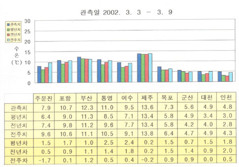 o 금주(2002. 3.17 ∼ 3.23)의 한반도 연안 표면수온은 동해 연안역 8∼11도,
