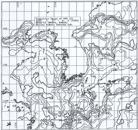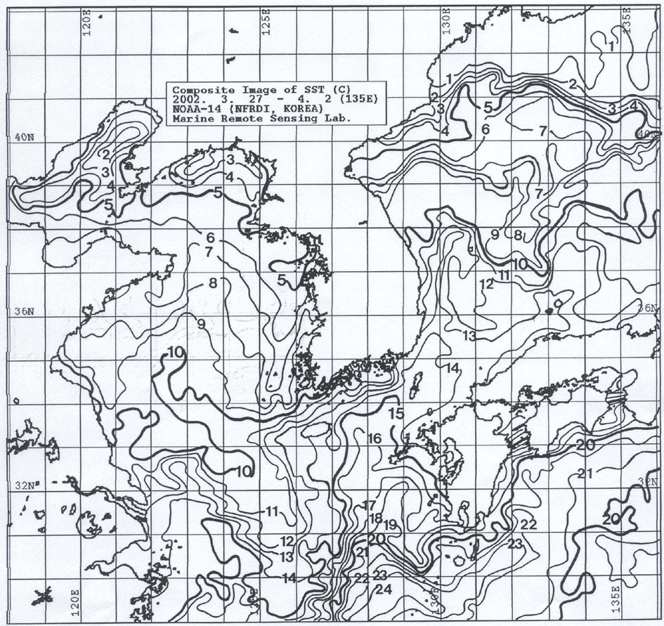 o 2002년 3월 27일∼4월 2일까지 위성영상을 합성한 광역 수온분포도 입니다.