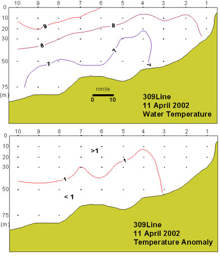 309선(군산 서방)의 수직수온분포도 및 평년편차도 입니다.