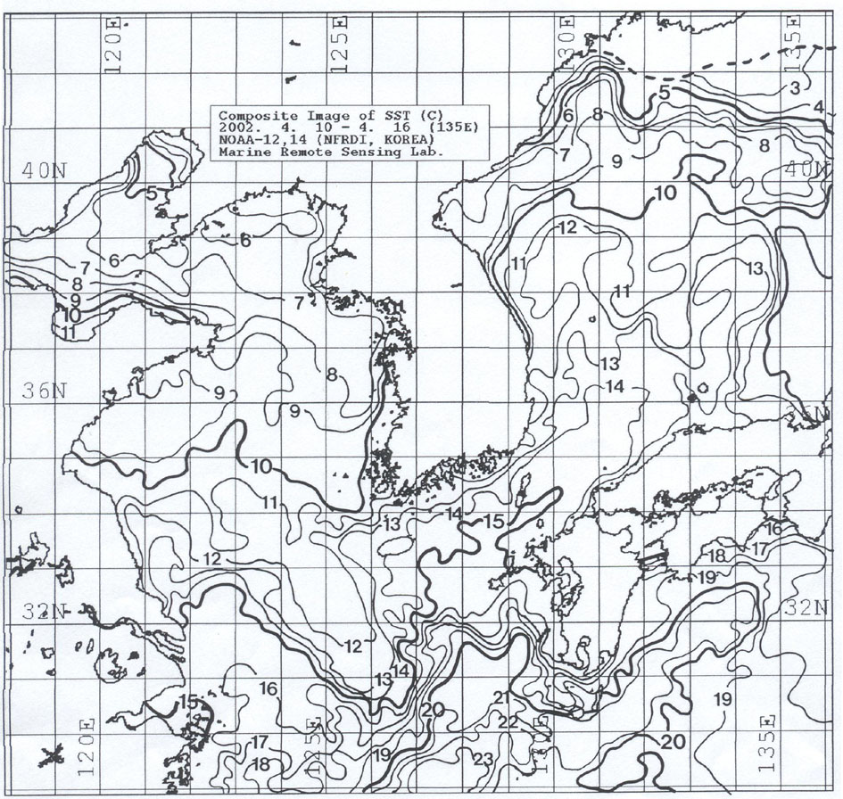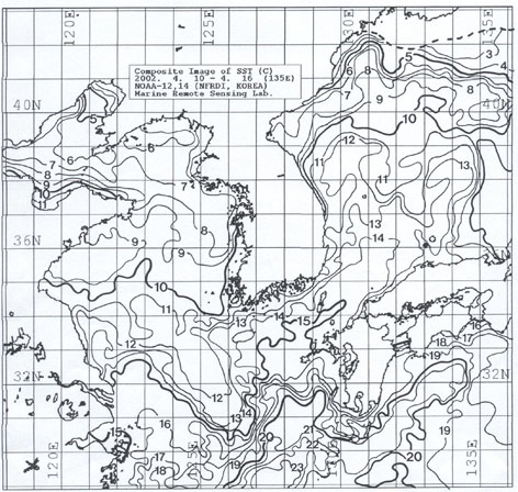 2002년 4월 3일∼4월 9일까지 위성영상을 합성한 광역 수온분포도 입니다.