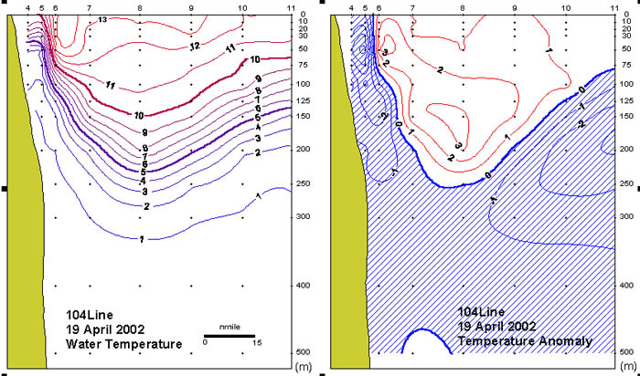 하층은 전반적으로 1도 정도 저온의 경향을 보였으며 연안측은 2∼4도 정도 낮게 나타났다.