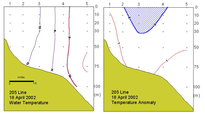 205선(소리도 남방)의 수직수온분포도 및 평년편차도 입니다.
