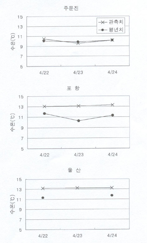 o 최근(2002년 4월 22일∼4월 24일) 동해 연안 수온은 9.6∼11.7도 입니다