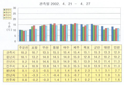 남해 연안역에서는 부산 0.5도 낮음을 제외하고 0.5∼1.5도 높게,