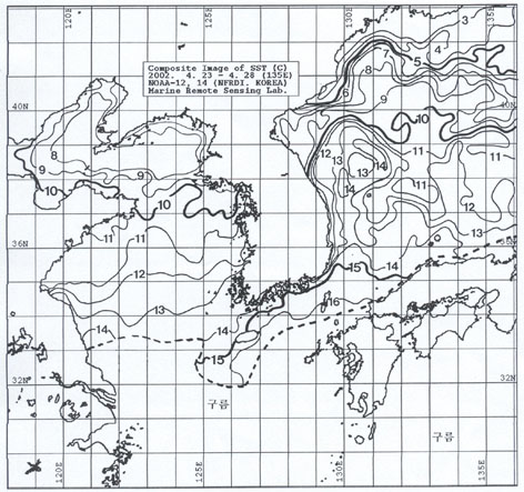 o 2002년 4월 23일∼4월 28일까지 위성영상을 합성한 광역 수온분포도 입니다.