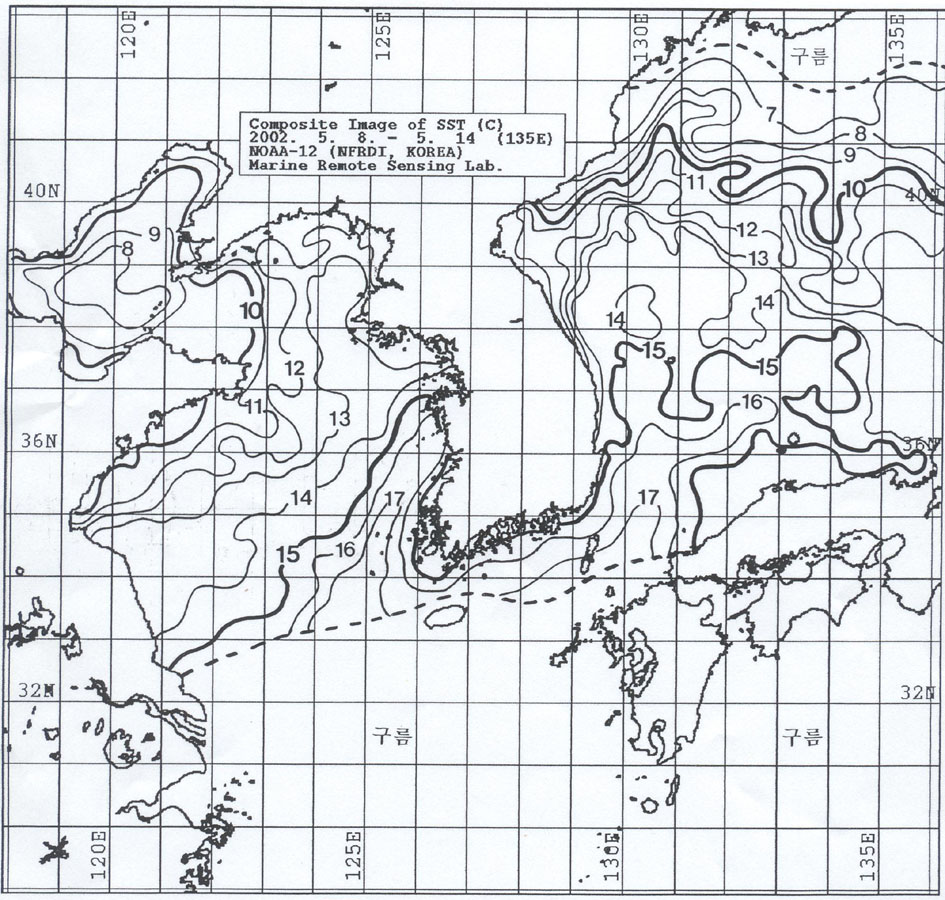 o 2002년 5월 8일∼5월 14일까지 위성영상을 합성한 광역 수온분포도 입니다. o 대화퇴 근해 11∼13도, 울릉도 근해 14∼15도, 대마도 근해 16∼18도, 일향초 근해 15∼16도, 어청도 근해 13∼15도 내외로 나타날 것입니다.. o「평년에 비해」수온은 대화퇴 울릉도, 대마도 근해 비슷하게, 일향초 및 어청도 근해에서는 1∼2도 높게 나타날 것입니다. o 수온전선대는 수온 14도를 중심으로 속초시∼동해시 연안역에서 형성될 것입니다. < 위의 그림을 클릭하시면 확대된 수온정보를 보실 수 있습니다 >