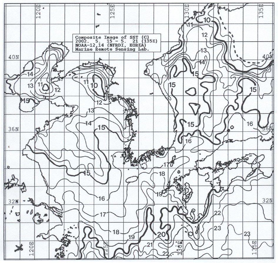 o 2002년 5월 15일∼5월 21일까지 위성영상을 합성한 광역 수온분포도 입니다.