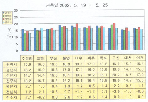 o 금주(2002. 6.2 ∼ 6.8)의 한반도 연안 표면수온은 동해 연안역 16∼17도,