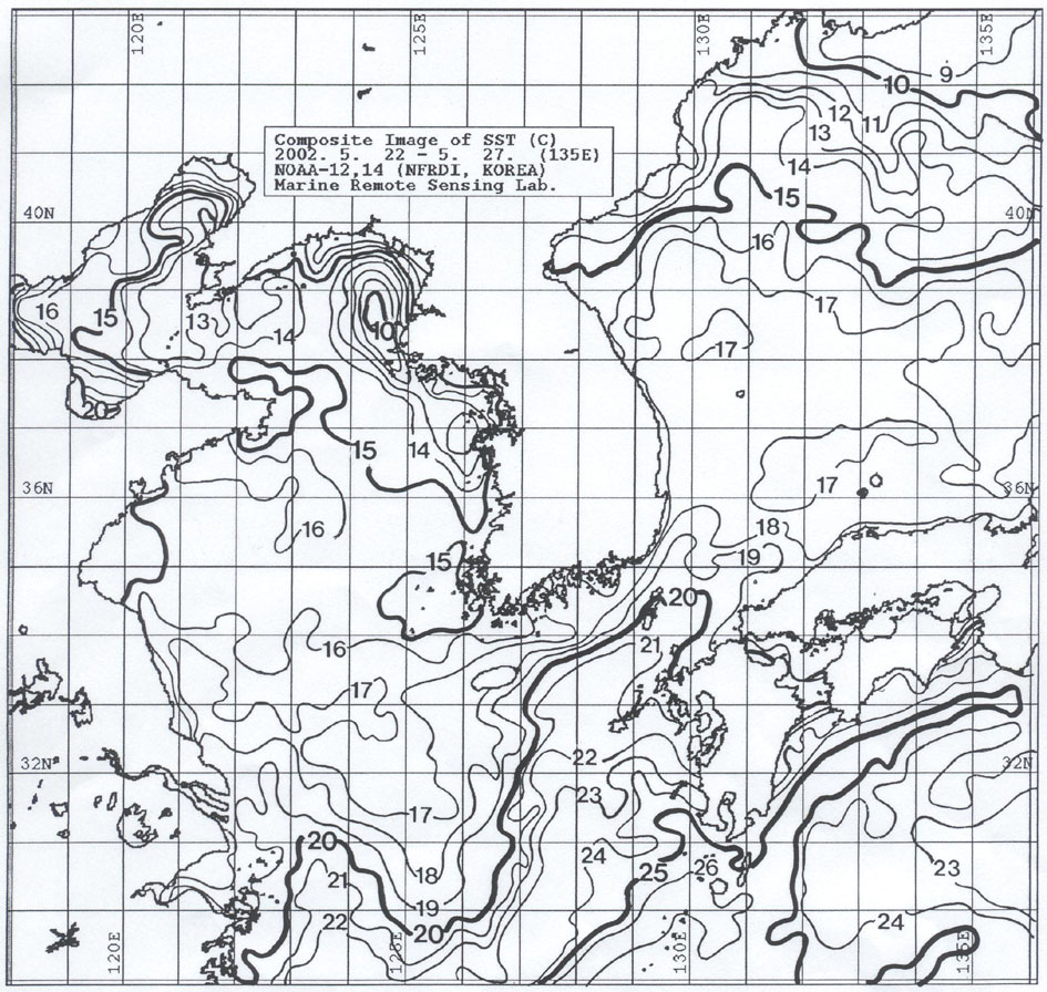 o 2002년 5월 22일∼5월 27일까지 위성영상을 합성한 광역 수온분포도 입니다.