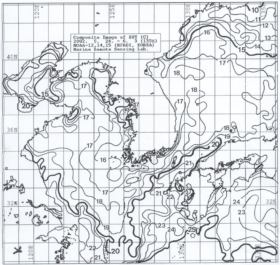 o 2002년 5월 28일∼6월 3일까지 위성영상을 합성한 광역 수온분포도 입니다.