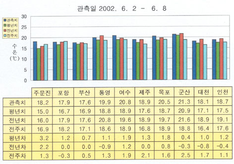 o 금주(2002. 6.16 ∼ 6.22)의 한반도 연안 표면수온은 동해 연안역에서