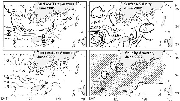 ㅇ 평년에 비해 표면수온은 2∼5도 정도 고온상을 보였으며,