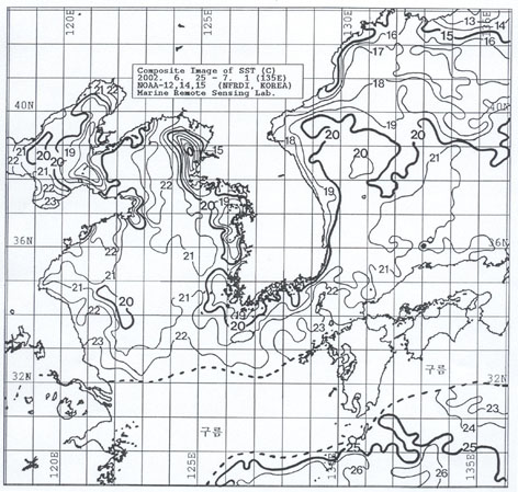 o 2002년 6월 25일∼7월 1일까지 위성영상을 합성한 광역 수온분포도 입니다.