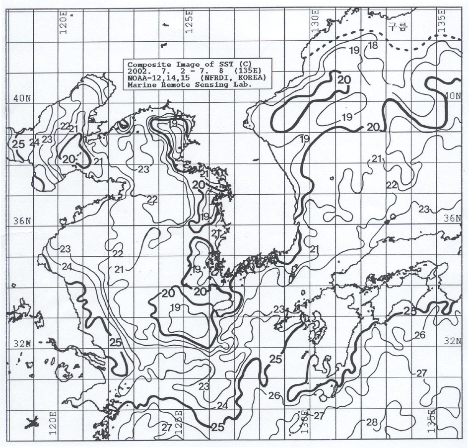 o 2002년 7월 2일∼7월 8일까지 위성영상을 합성한 광역 수온분포도입니다.