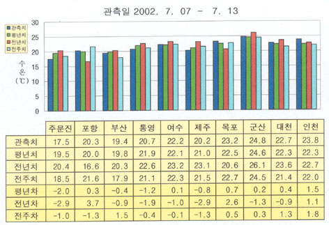 o 금주(2002. 7.21 ∼ 7.27)의 한반도 연안 표면수온은 동해 연안역에서
