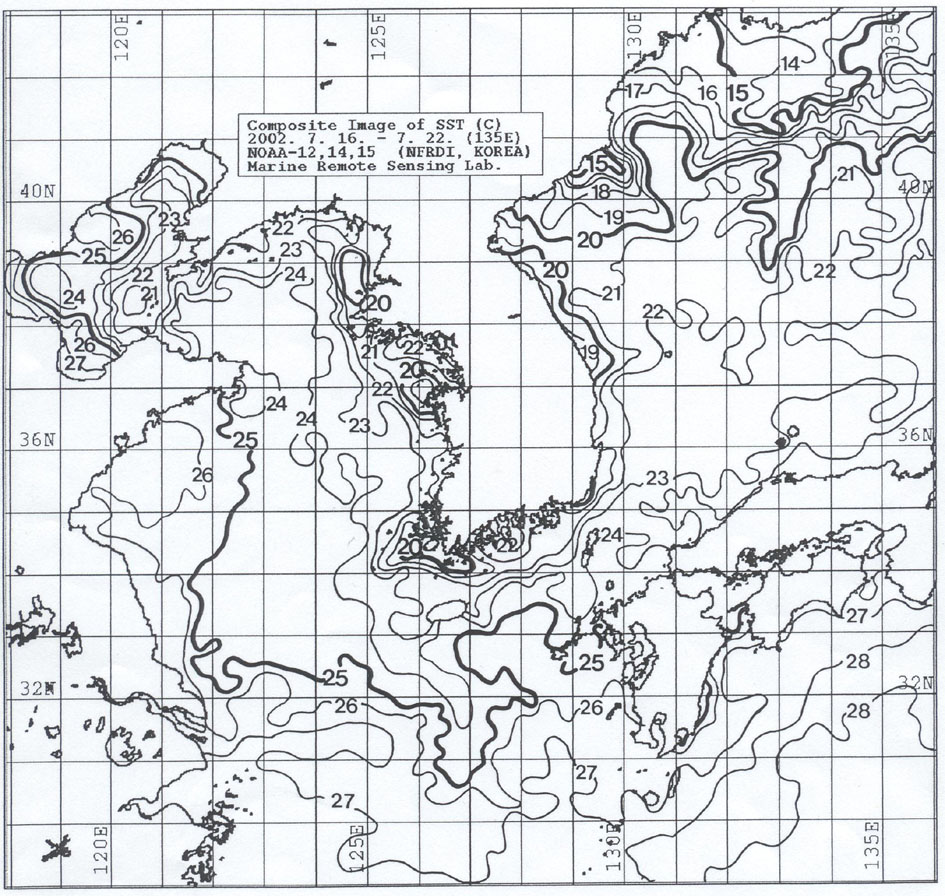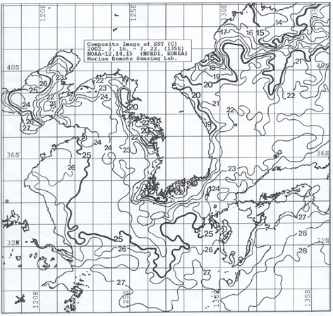 o 2002년 7월 16일∼7월 22일까지 위성영상을 합성한 광역 수온분포도입니다.