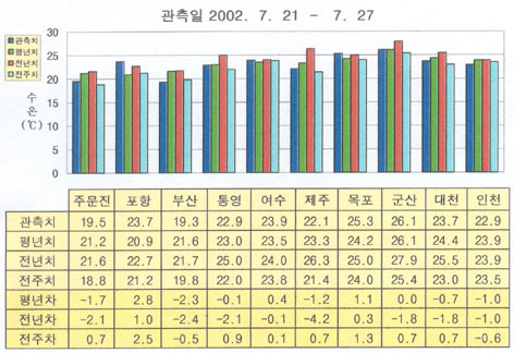 o 금주(2002. 8.4 ∼ 8.10)의 한반도 연안 표면수온은 동해 연안역에서