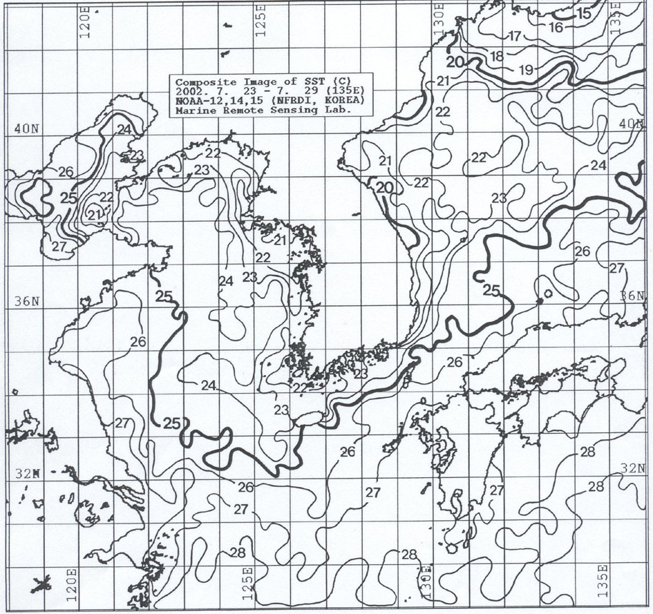 o 2002년 7월 23일∼7월 29일까지 위성영상을 합성한 광역 수온분포도입니다. o 대화퇴 근해 22∼24도, 울릉도 근해 23∼24도, 대마도 근해 25∼26도, 제주도 근해 24∼25도, 이어도 근해 26∼27도, 일향초 및 어청도 근해 22∼23도 내외로 나타날 것입니다. o「평년에 비해」수온은 대화퇴 근해 비슷하게, 울릉도 근해 및 대마도 근해 0.5도 낮게, 제주도 근해 및 이어도 근해 1.5도 낮게, 일향초 및 어청도 근해에서는 2도 정도 낮게 나타날 것입니다. o 수온전선대는 수온 24도를 중심으로 제주도-대마도간 해역에서 형성 및 수온 22도를 중심으로 주문진-울릉도간 해역에서 형성될 것입니다. < 위의 그림을 클릭하시면 확대된 수온정보를 보실 수 있습니다 >
