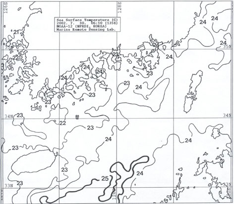 o 2002년 7월 30일 06시 10분 현재의 위성추정 표면수온분포도 입니다.