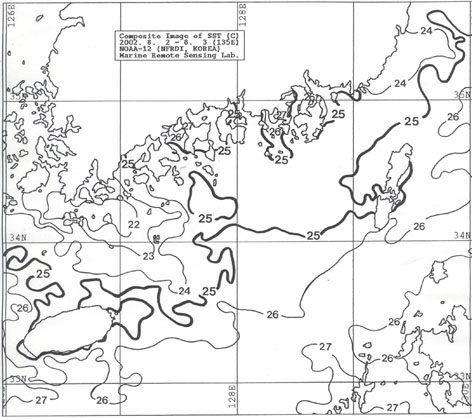 o 2002년 8월 2일 및 8월 3일 오전 5시 현재의 위성추정 표면수온