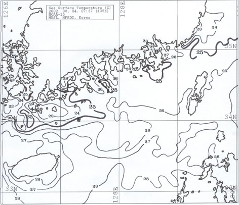 o 2002년 8월 4일 오전 07시 37분 현재의 위성추정 표면수온 분포도입니다.