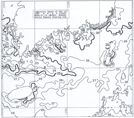 o 아래 그림은 2002년 8월 4∼6일 05시 현재 합성한 위성추정 수온