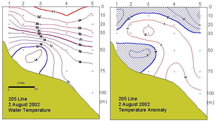 205선(소리도 남방)의 수직수온분포도 및 평년편차도 입니다.
