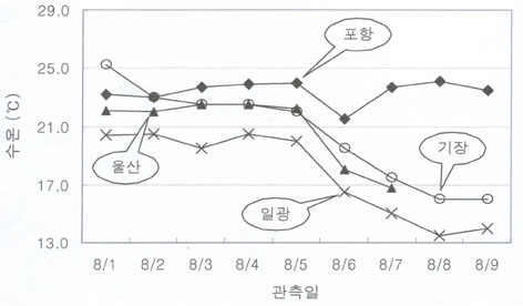 o 2002년 8월 9일 오전 10시 현재의 연안 관측수온은 부산항 21도, 기장 16도,
