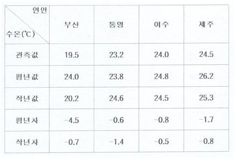 o 2002년 8월 10일 10시 현재 관측된 남해 연안 수온은 부산 19.5도,