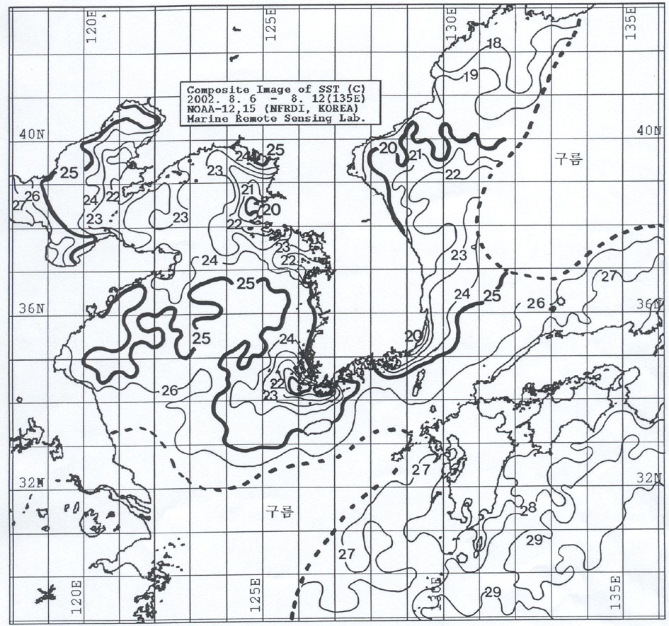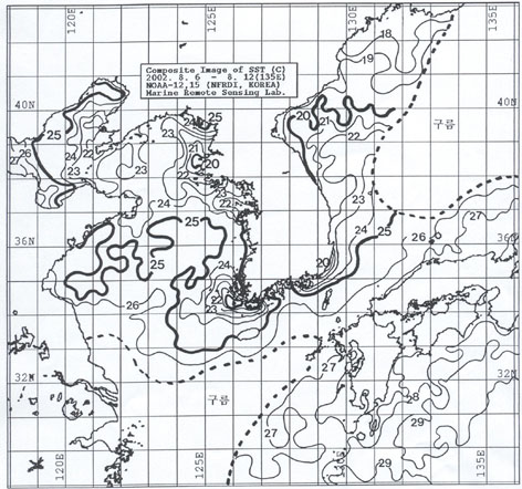 o 울릉도 근해 수온은 섭씨 24∼25도, 대마도 및 제주도 근해 25∼26도,