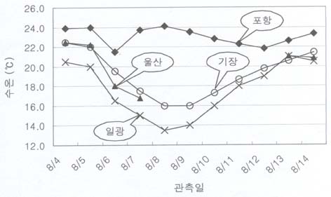 o 동해남부 연안수온이 주변 수온과의 차가 5도 범위이내임으로 지난
