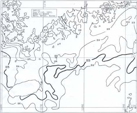 거제도∼부산연안에서 22∼23도, 제주도-대마도간 근해역에서는 25∼26도로
