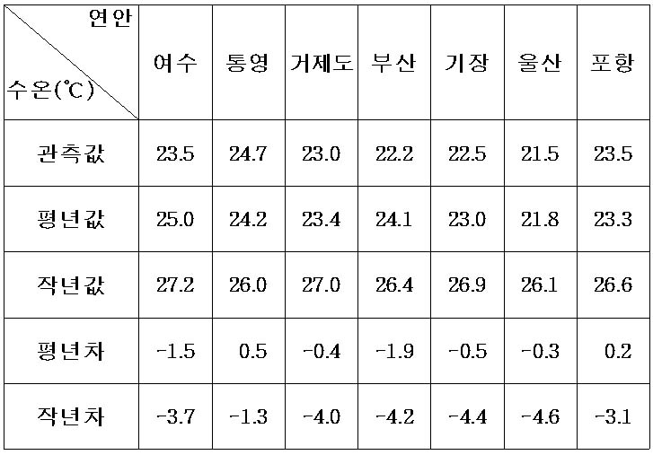 o 작년에 비해 오늘 수온은 여수 4도, 통영 1.5도, 거제도 및 부산 4도,