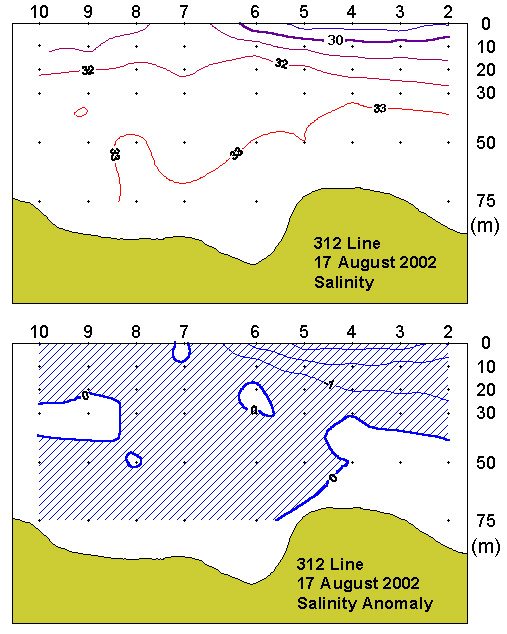 312선(제주해협 서방)의 수직염분분포도 및 평년편차도 입니다.