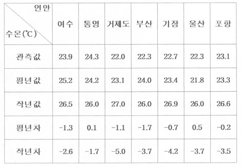 o 작년에 비해 오늘 수온은 여수 2.5도, 통영 1.5도, 거제도 5도, 부산,