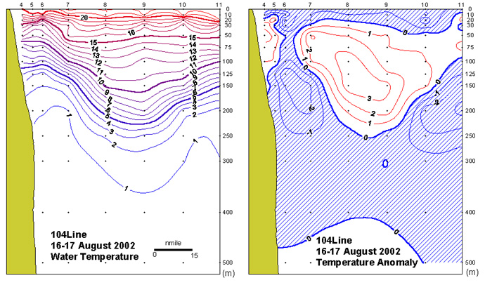 104선(죽변 동방)의 수직수온분포도 및 평년편차도 입니다.