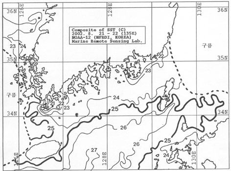 o 아래 그림은 2002년 8월 21∼22일 05시 현재 합성한 위성추정 수온