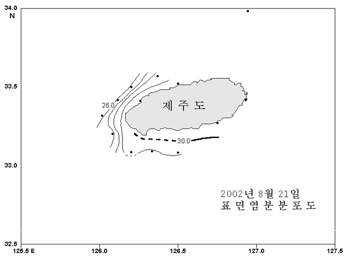 ㅇ 제주도 서북방 10마일 부근에 26.0 내외로 수심 약 5m까지 염분이