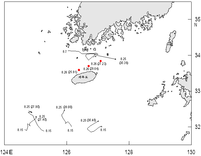 ㅇ 국립수산과학원에서 조사한 제주도 북부 근해역의 염분농도와