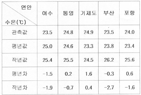 o 평년에 비해 오늘 수온은 통영, 거제도, 포항 연안에서 0.5도 높게, 여수,