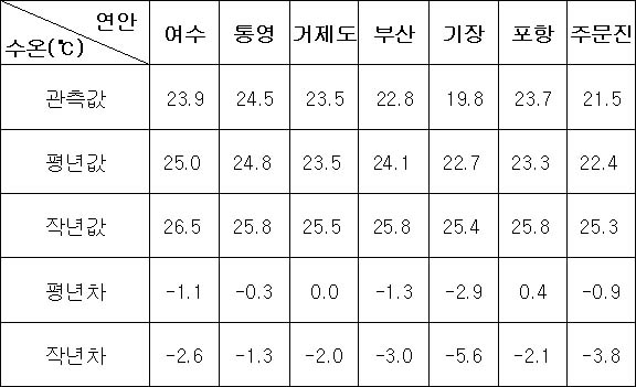 o 작년에 비해 오늘 수온은 여수~통영 1∼2.5도 낮게, 거제도 ~ 부산 2∼3도