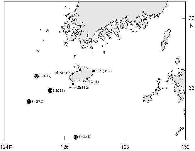 ㅇ 오늘 제주도 연안의 염분은 제주시 30.2, 한림 31.2, 남원 31.1, 우도 31.9, 마라도 34.2로 정상상태입니다.
