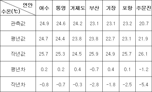 o 작년에 비해 오늘 수온은 여수~통영 0.5∼1도 낮게, 거제도 비슷하게,