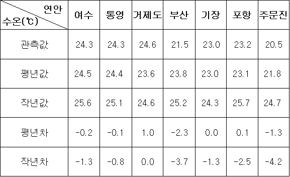 o 평년에 비해 오늘 수온은 여수 및 통영 비슷하게, 거제도 1도