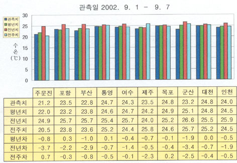 o 금주(2002. 9.15 ∼ 9.21)의 한반도 연안 표면수온은 동해 연안역에서