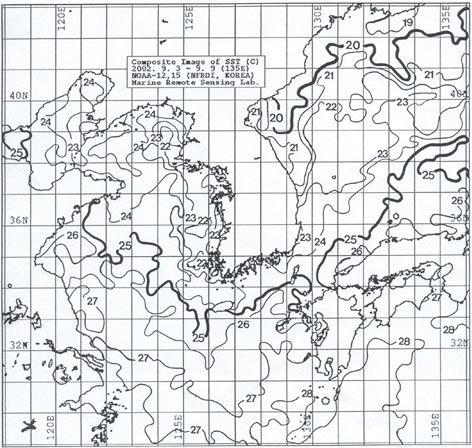 o 근해 표면 수온은 대화퇴 21∼22도, 울릉도 22∼23도, 대마도 및