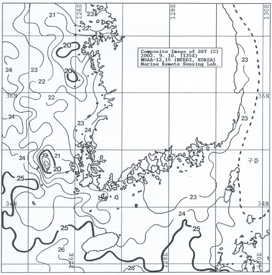 o 아래 그림은 2002년 9월 10일 06시 현재의 위성 추정 표면 수온 분포도 입니다. o 남해 연안역 수온은 섭씨 23∼24.5도, 남해 근해역은 24∼26도 수온 분포를 나타내고 있습니다. o 서해 연근해역 수온 분포는 23∼25도 분포를 보이나, 태안반도 및 진도 연근해역에서 20도 이하의 찬물을 중심으로 조석으로 인한 수온 전선대가 형성되고 있습니다.