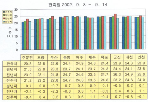 o 최근(2002. 9.8 ∼ 9.14)의 한반도 연안 표면수온은 동해 연안역에서 섭씨