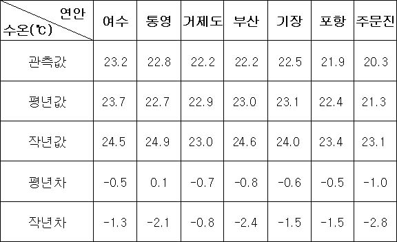 o 작년에 비해 오늘 수온은 여수~부산 1~2.5도 낮게, 기장~주문진 1.5~3도